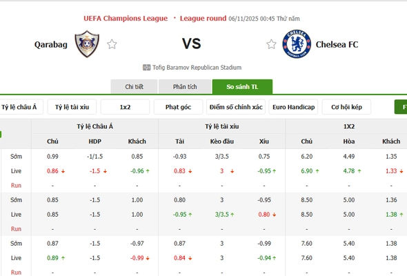 Tỷ kệ kèo Qarabag vs Chelsea